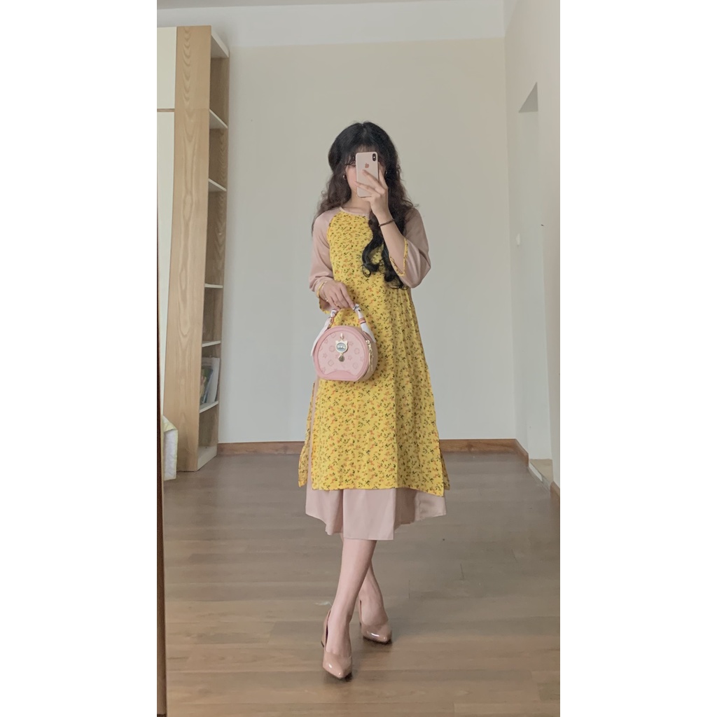 Giới thiệu ÁO DÀI CÁCH TÂN NỮ DÁNG SUÔNG TAY LỠ CỔ TRÒN HOA NHÍ KÈM CHÂN VÁY MAY SẴN MẶC TẾT MÀU ĐỎ VÀ MÀU VÀNG - ADXHN-Đỏ, Vàng