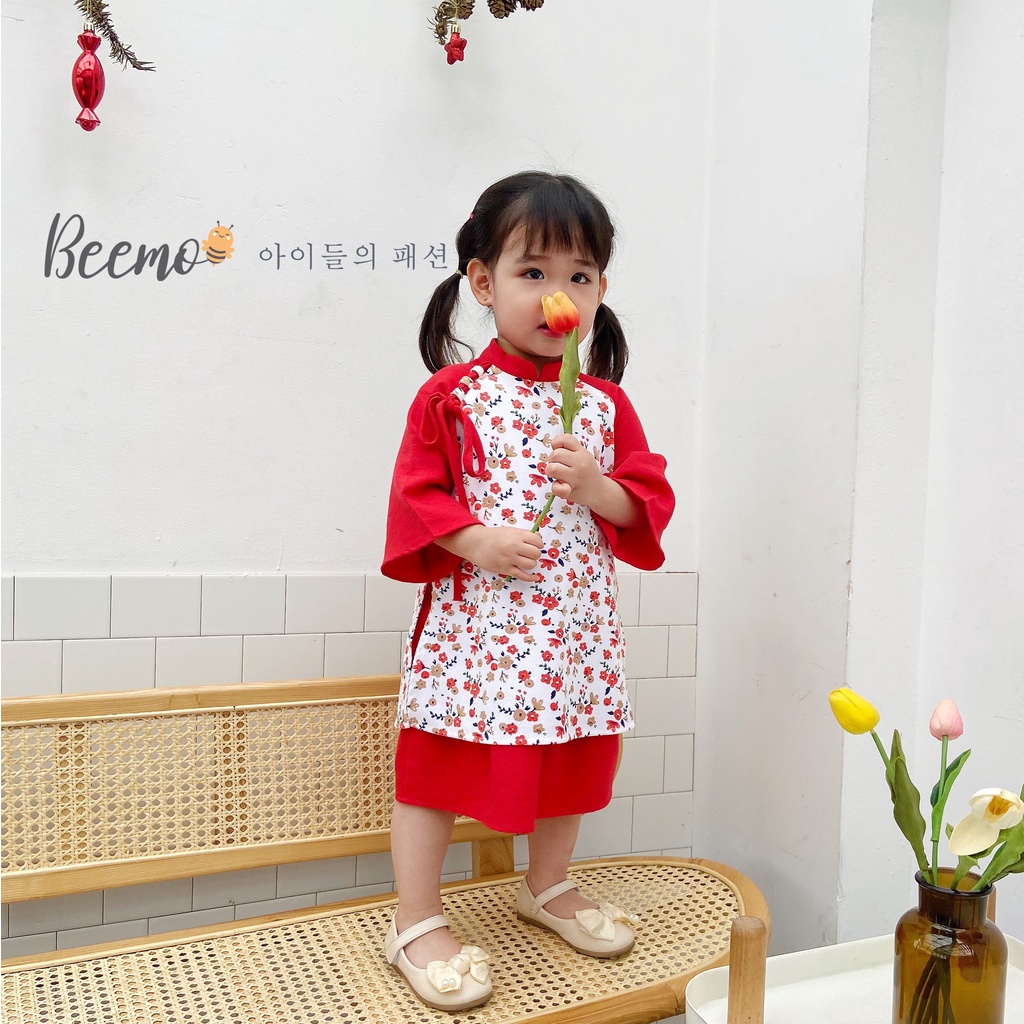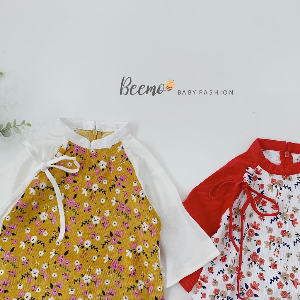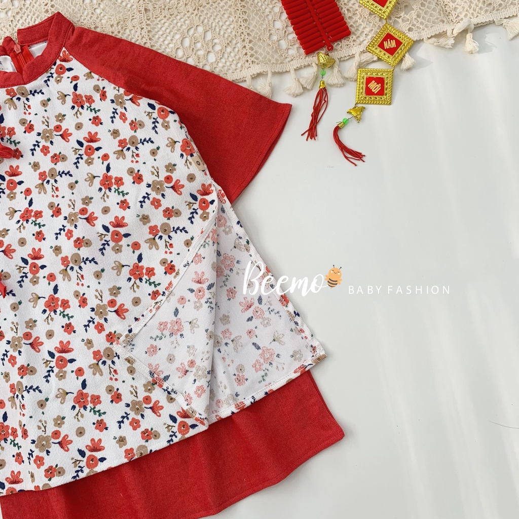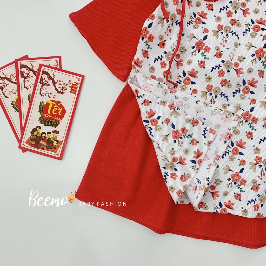 Áo dài Tết cho bé gái Beemo, Chất liệu nhung tăm mềm min, họa tiết hoa nhí xinh xắn, 2 màu cực đẹp B101