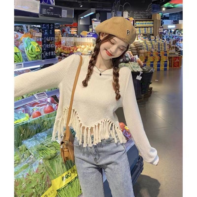Giới thiệu Áo dệt kim BH nữ dài tay cổ tròn lưng cao viền phối tua thời trang Hàn