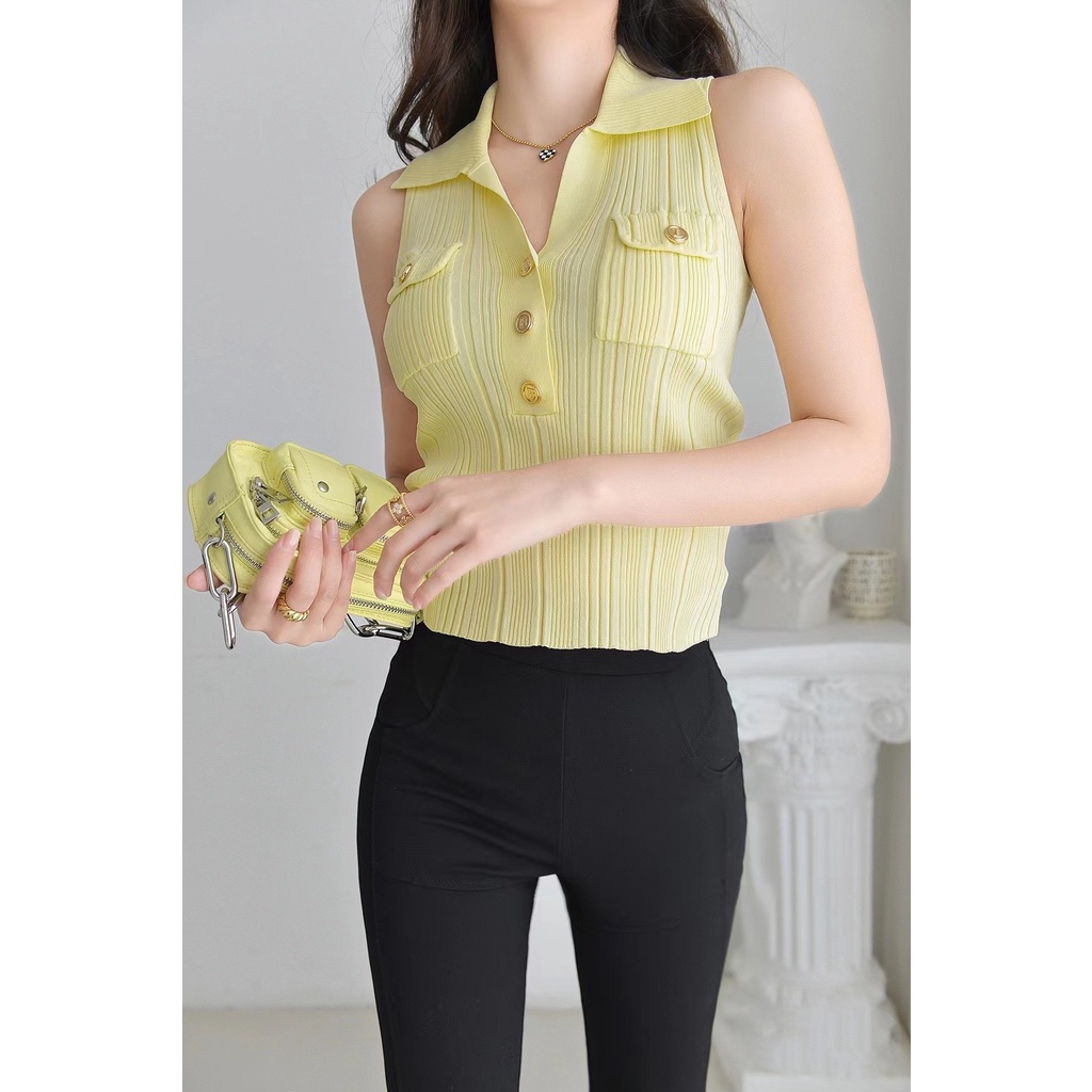 Giới thiệu Áo Dệt Kim Sát Nách Cổ Polo Dáng Ôm Co Giãn Thời Trang Mùa Hè Hàn Quốc 2023