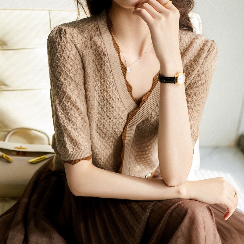 Giới thiệu Áo Dệt Kim Vải Lụa Mát Phối Ren Dễ Thương 157401 Áo Khoác Cardigan Mỏng Cổ Chữ v Phong Cách Retro Thời Trang