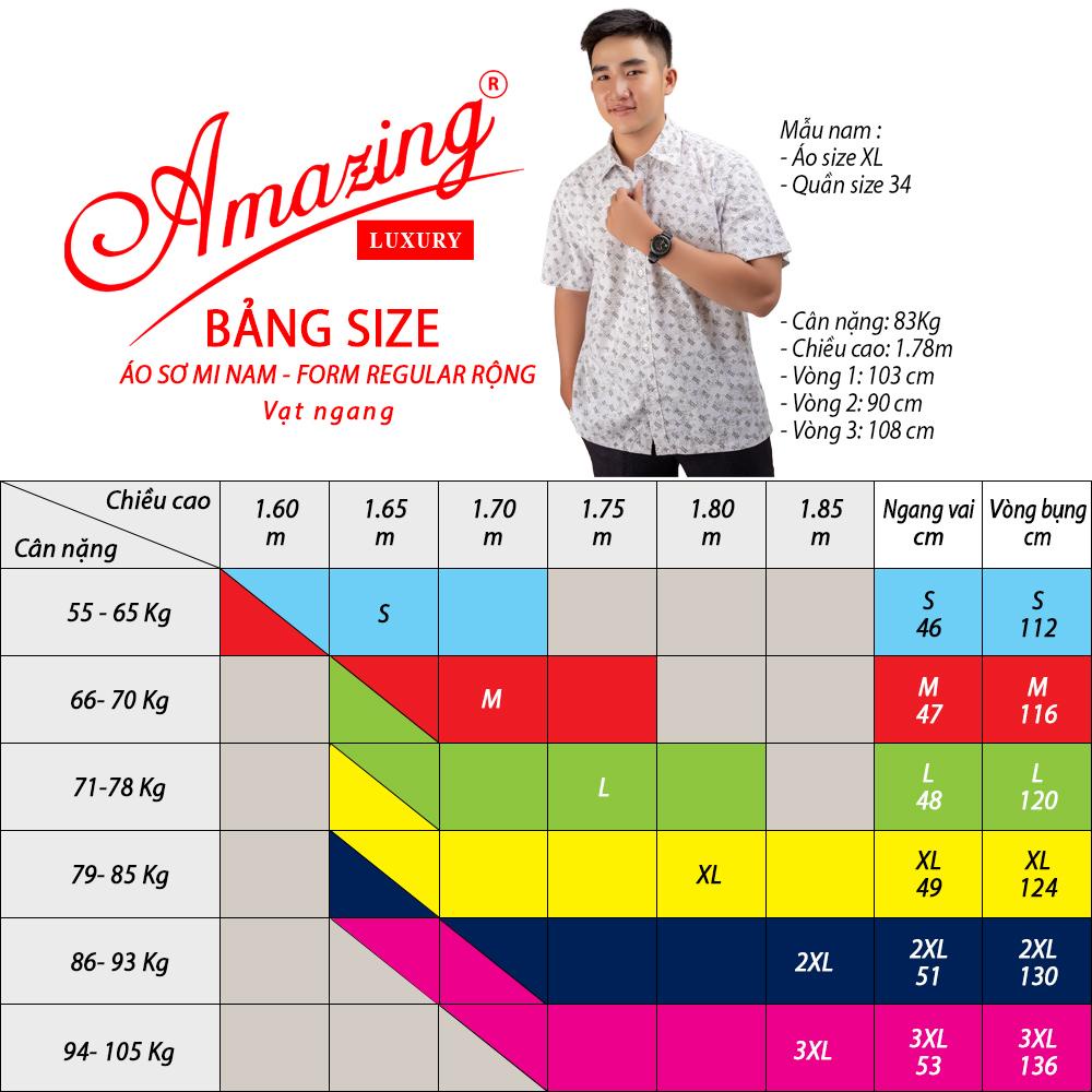 * HƯỚNG DẪN CHỌN SIZE ÁO SƠ MI NAM HỌA TIẾT: Bạn xem bảng quy đổi (thông số thành phẩm áo) để chọn size phù hợp, nếu còn phân vân, xin vui lòng inbox, Shop sẽ tư vấn tận tình. Các chỉ số trong bảng thông số không tuyệt đối chính xác, giao động trong khoảng +-2cm, số cân nặng chỉ là khoảng ước chừng, đúng với số đông, chứ không đúng trong mọi trường hợp Nếu bạn không cao hoặc có vòng bụng lớn, bạn chọn tăng size lên cho vừa bụng, đặc tính mã hàng này là mặc rộng rãi + Quý khách muốn đổi size khác, xin vui lòng liên lạc với công ty theo thông tin in trên bao bì, nhãn mác. Qúy khách vui lòng thanh toán phí ship đổi hàng 2 chiều cho bên đơn vị vận chuyển ạ !