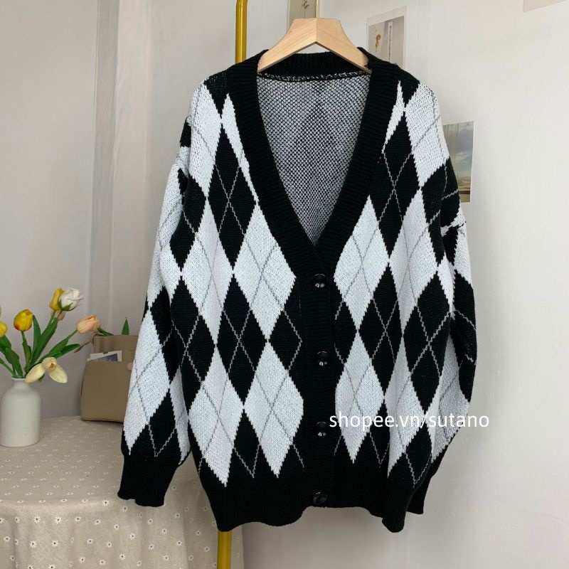 Giới thiệu Áo khoác len nữ cardigan caro dáng dài họa tiết trám kim cương sang chảnh A519 SUTANO