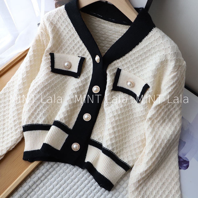 Giới thiệu Áo Khoác Nữ Cardigan Len Dáng Ngắn Cúc Ngọc Đen Kem - HQC