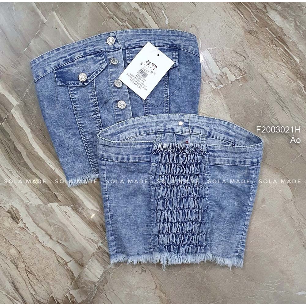 Áo kiểu jean quây nút dáng croptop ngực đắp túi nắp lưng chun!