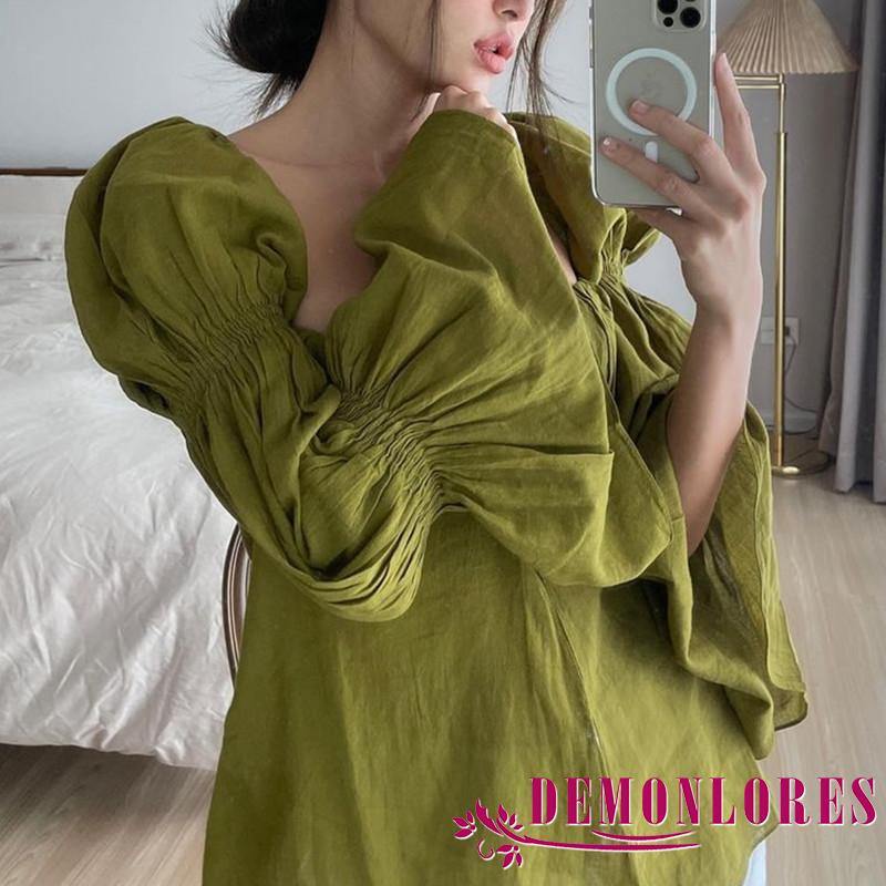 Giới thiệu Áo kiểu tay dài ống loe cổ vuông màu trơn xếp nếp xẻ tà phía trước thời trang xuân thu dành cho bạn nữ