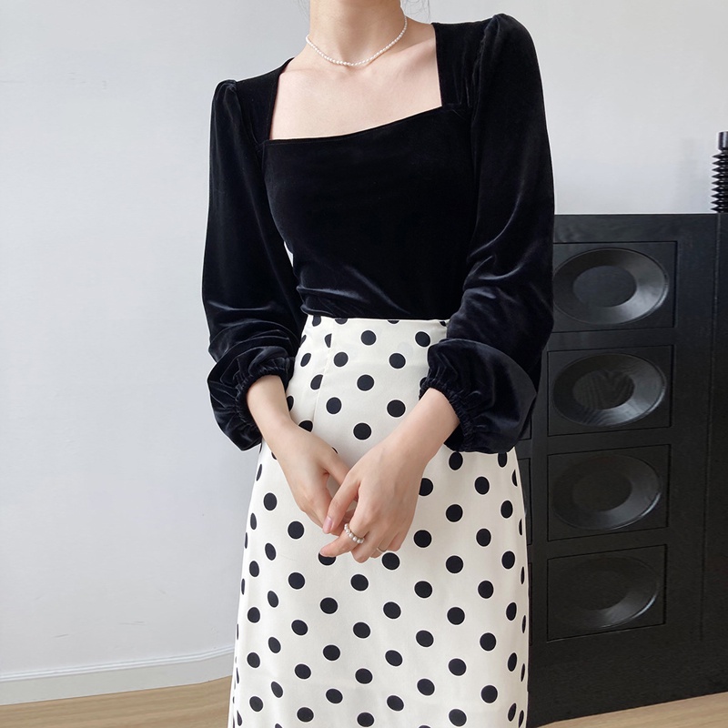 Giới thiệu Áo Kiểu Tay Phồng Dài Cổ Vuông Màu Đen Vải Nhung Phong Cách Pháp Thời Trang Cho Nữ