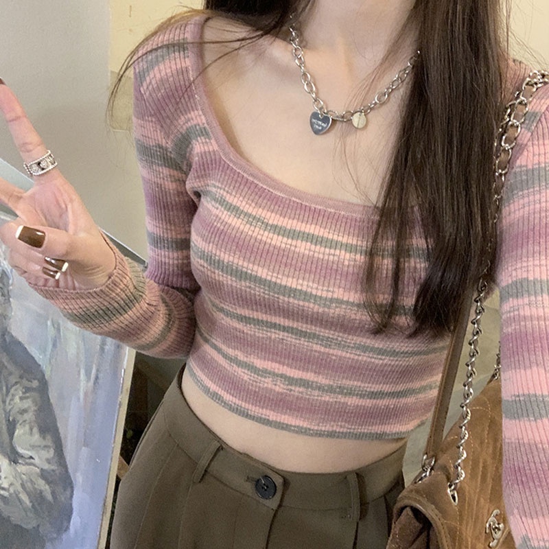 Áo kiểu YEYA dệt kim dáng ngắn ôm vừa vặn hở rốn họa tiết kẻ sọc thời trang mới dành cho nữGiá CONAN