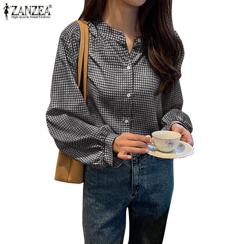 Giới thiệu Áo Kiểu ZANZEA Họa Tiết Caro Tay Dài Thiết Kế Nút Gài Trước Ngực Thời Trang Nữ