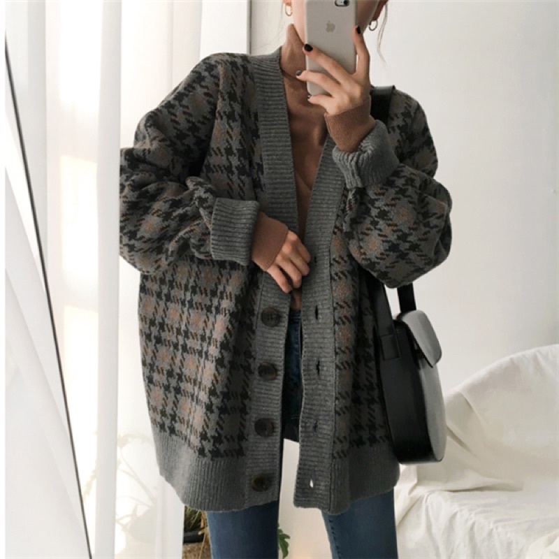 Thời Trang Nữ > Áo khoác, Áo choàng & Vest > Áo khoác ngoài > Áo len cardigan nữ phom rộng dài tay hoạ tiết kẻ vintage chất đẹp phong cách Hàn Quốc, đường phố, cá tính