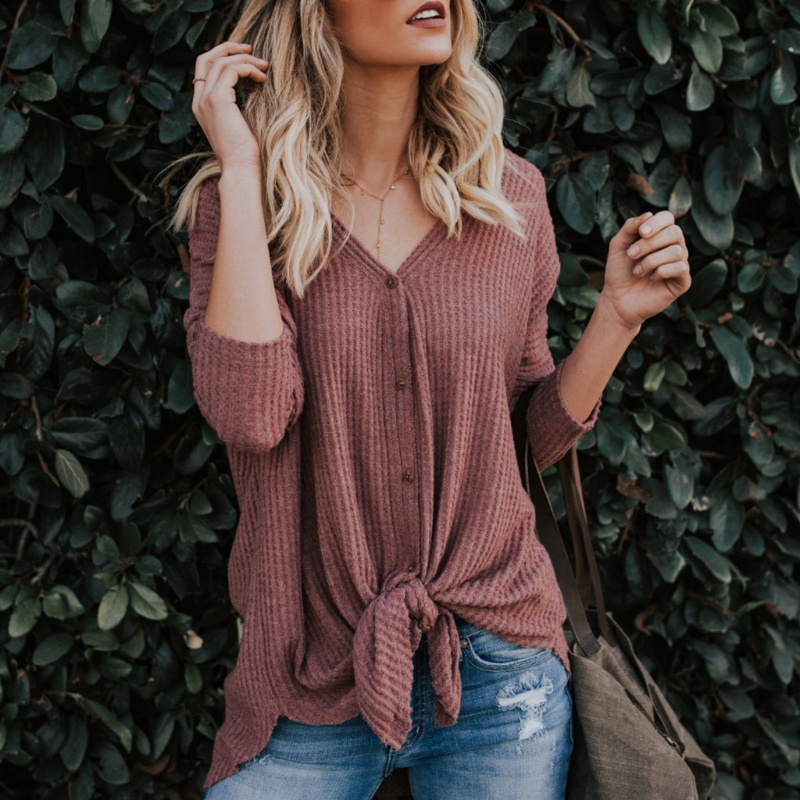 Áo len nữ Cà vạt Nút phía trước xuống dệt kim Jumper Áo sơ mi dài tay áo sơ mi dài tay Mô tả: