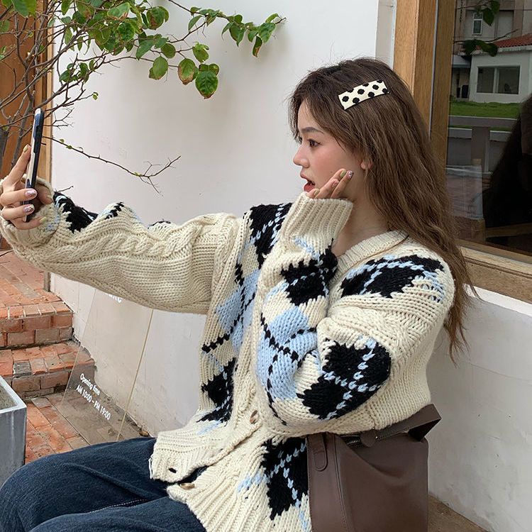 Giới thiệu Áo Len Nữ Dài Tay Cổ Chữ V Form Rộng Họa Tiết Hình Thoi Thời Trang