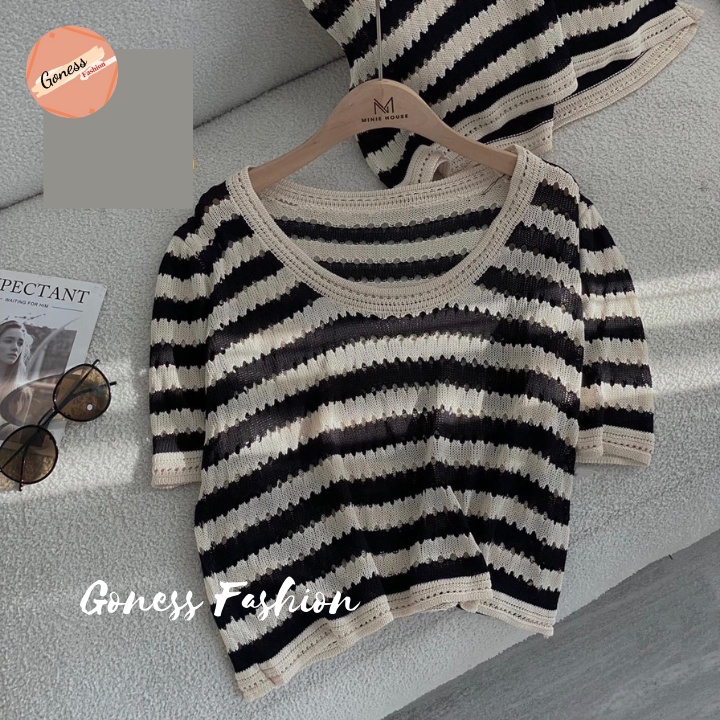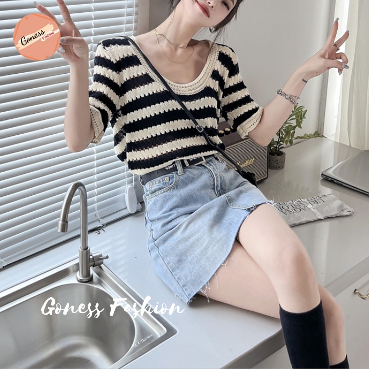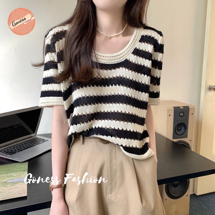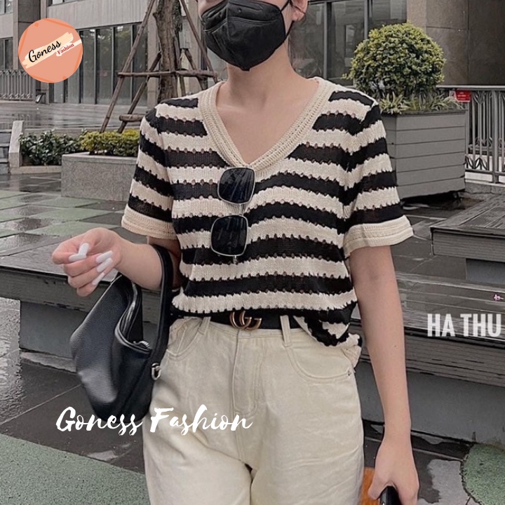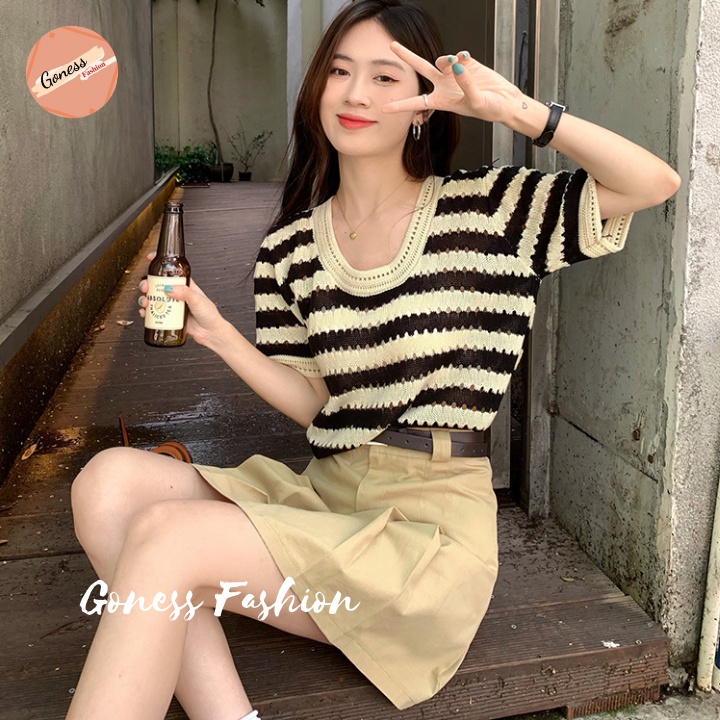 Giới thiệu Áo len nữ Goness chất vải dệt kim ngắn tay họa tiết kẻ sọc kiểu cổ cardigan phong cách hàn quốc