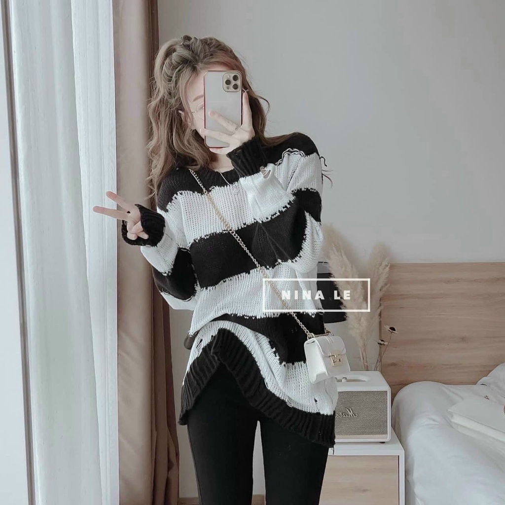 Áo len kẻ rách form rộng giấu quần #s149k Mặc siêu xinh vào vụ cước lên tiền lên là ko có giá này đâu ạ