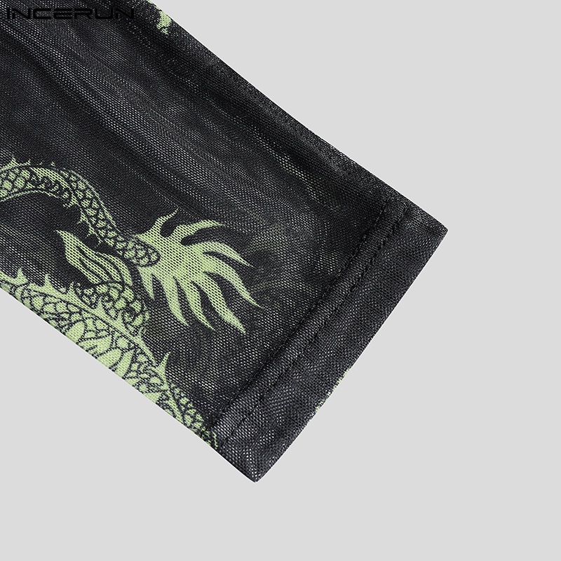 Giới thiệu Áo liền quần INCERUN tay dài vải lưới xuyên thấu in hình rồng phong cách vintage thời trang cá tính cho nam