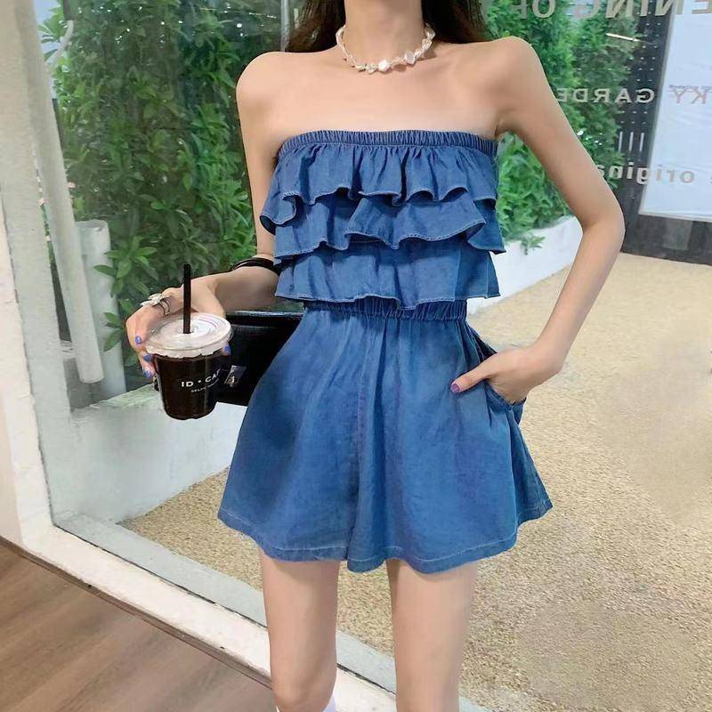 Giới thiệu Áo Liền Quần Ống Rộng Vải Bò Một Bên Vai Quần Soóc Nữ Áo Liền Quần Ống Rộng Mỏng Khoe Eo Cao