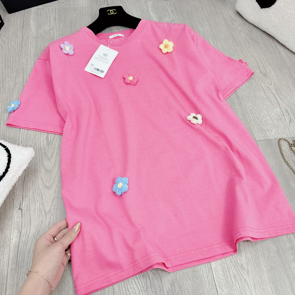 Áo Phông Hồng Đính Hoa Len Nổi Áo Thun Nữ Dáng Thụng Freesize Form Rộng
