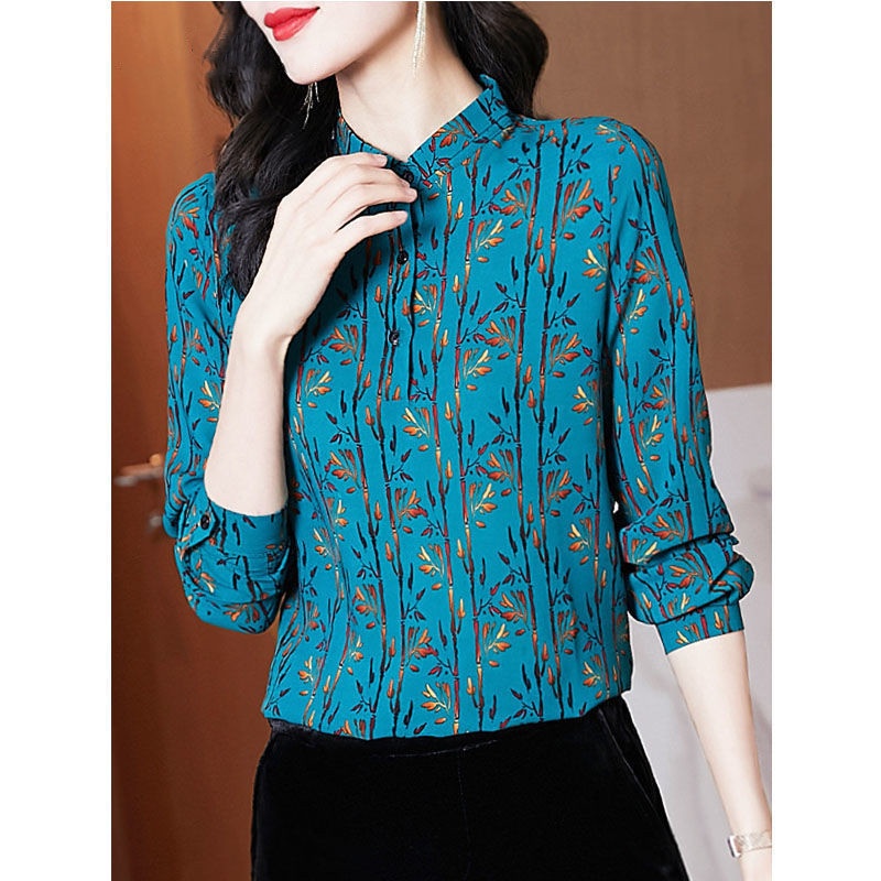 Tên vải | Voan Thành phần vải chính - sợi polyeste (polyester) Hàm lượng các thành phần vải chính: 51% -70% Phong cách 'CV commuter Mô hình: in Phong cách'Hedging Quy trình “In ấn ” nhuộm Loại phiên bản 'Loose Chiều dài quần áo: bình thường (50cm < chiều dài quần áo ≤ 65cm) Loại cổ áo 'Cổ áo đứng Loại tay áo - tay áo thông thường Chiều dài tay áo 'Dài tay Các yếu tố phổ biến-In ấn
