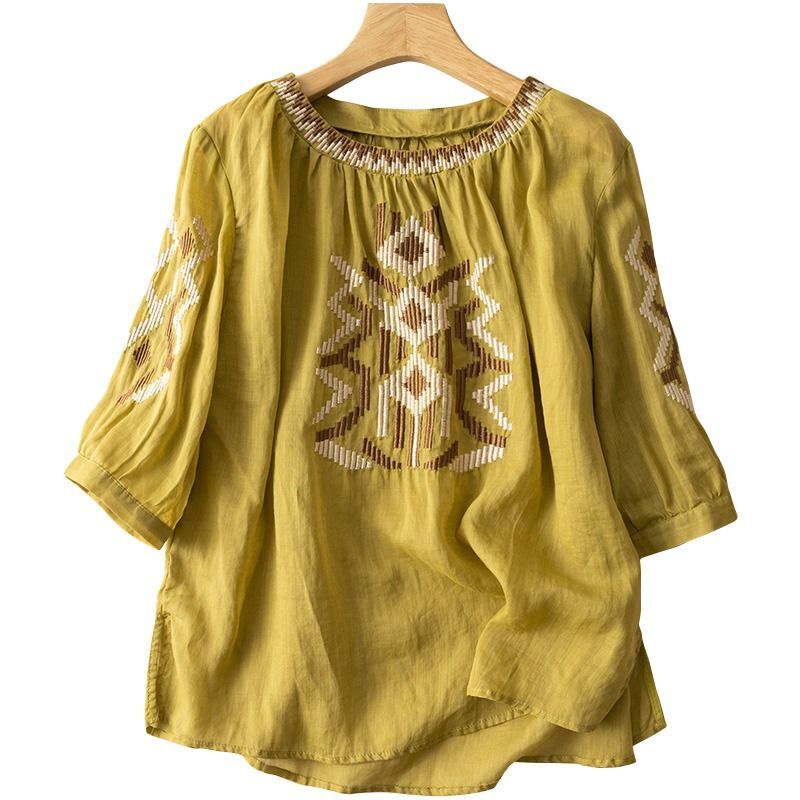 Giới thiệu Áo Sơ Mi Cotton Lanh Cổ Tròn Tay Ngắn Dáng Rộng Thêu Họa Tiết Xinh Xắn Thời Trang Mùa Hè Cho