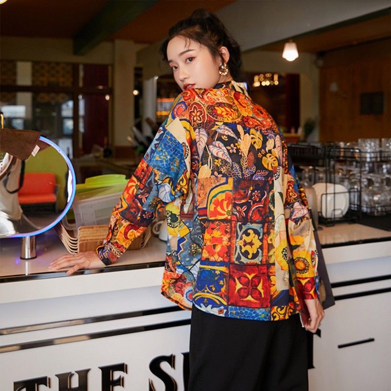 Giới thiệu Áo sơ mi dáng rộng tay dài họa tiết hoa hướng dương thời trang retro