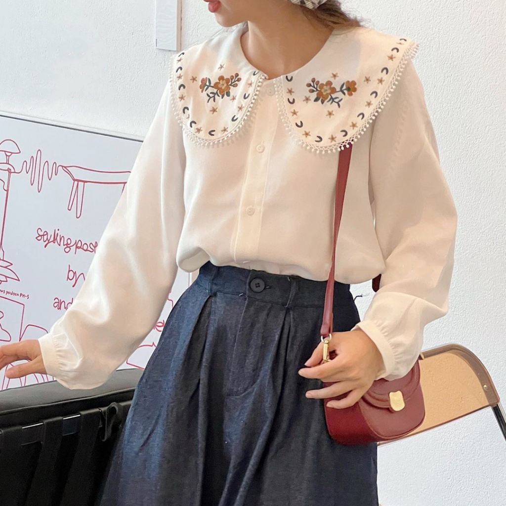 ÁO SƠ MI KIỂU CỔ BÈO THÊU HOA CHẤT DẠ DÀY DẶN STYLE TIỂU THƯ XINH XẮN 𝑵𝒆𝒘 𝒊𝒏 𝒔𝒕𝒐𝒓𝒆