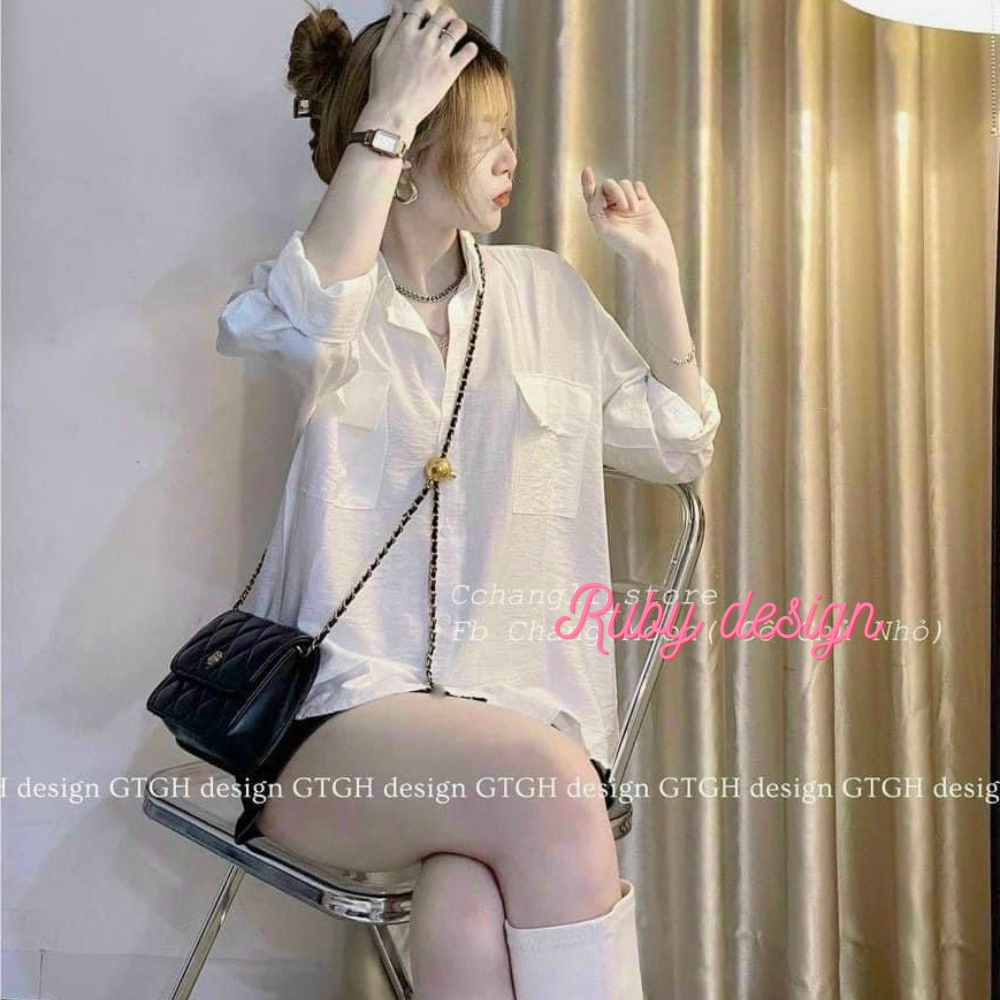 Áo sơ mi kiểu nữ áo sơ mi nữ vải đũi phom rộng 2 túi ngực màu trắng cao cấp phong cách hàn quốc đi chơi công sở RubyShop