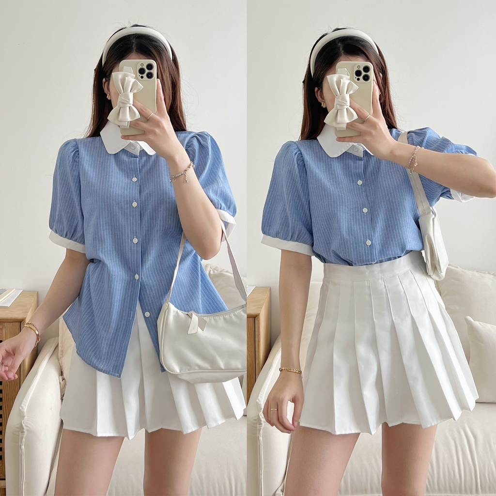 Giới thiệu Áo sơ mi kiểu nữ, Áo sơ mi tay phồng xếp ly vai kẻ sọc phối cổ bèo thanh lịch