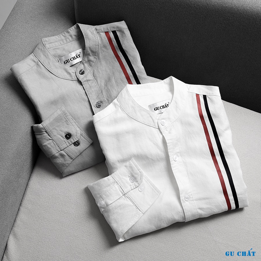 Giới thiệu Áo Sơ Mi Nam Dài Tay GU CHẤT, Trắng Phối Sọc Hiện Đại, Chất Vải Linen ( Đũi ) Mềm Mịn - GUD16