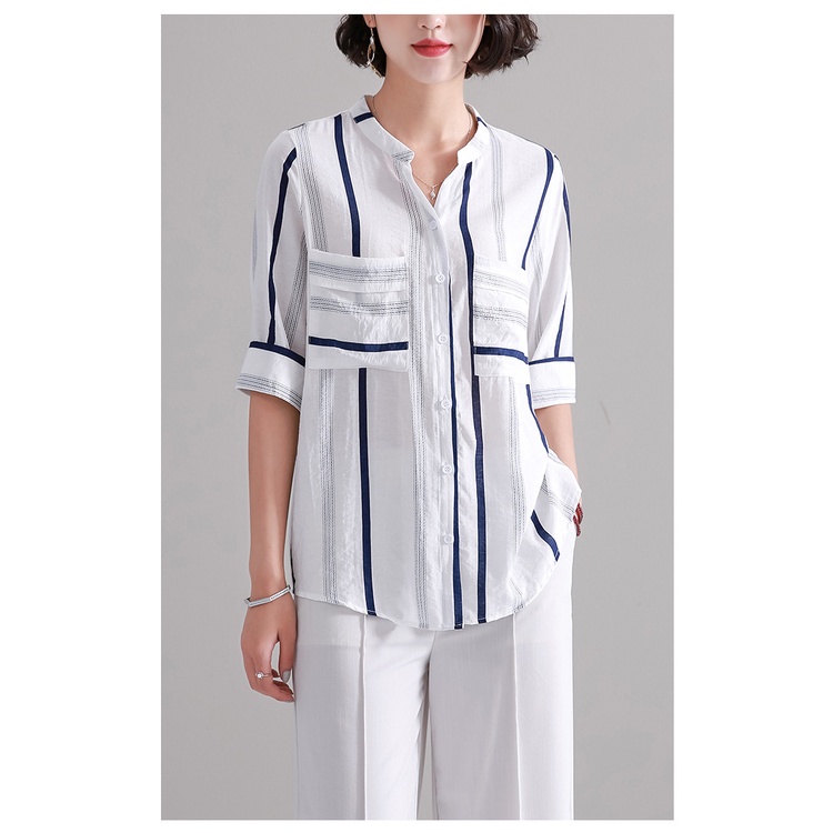 Tên vải: vải lanh cotton Thành phần vải chính: sợi polyester (polyester) Hàm lượng các thành phần vải chính: 51% -70% Phong cách: CV đi làm Họa tiết: Sọc Phong cách: áo nịt Chiều dài tay áo: nửa tay áo / tay áo giữa Quy trình: in / nhuộm Loại phiên bản: Loose Chiều dài quần áo: bình thường (50cm Quần áo placket: Một bên ngực Loại cổ áo: cổ đứng Kiểu tay áo: tay áo bình thường Thiết kế: in