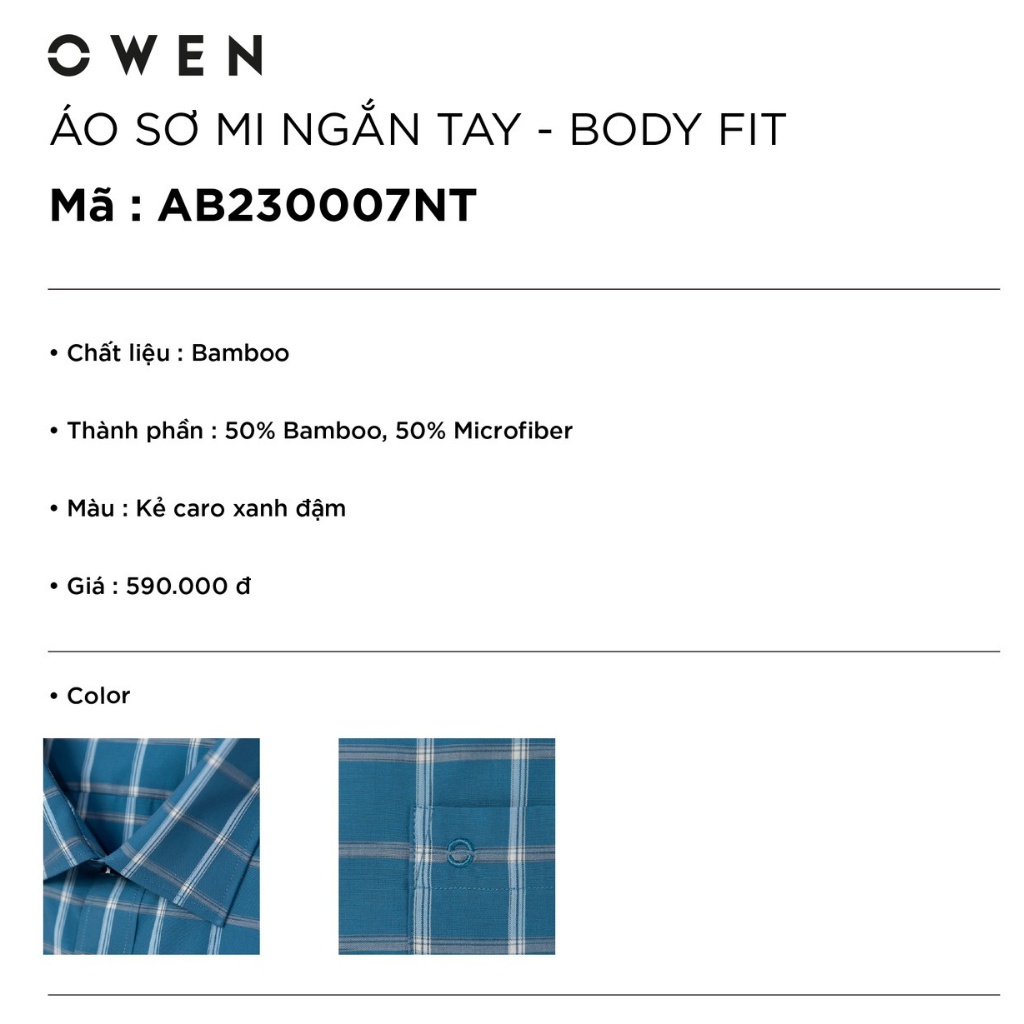 Giới thiệu Áo sơ mi ngắn tay nam OWEN AB230007NT somi công sở vải sợi tre cao cấp màu kẻ caro xanh đậm dáng body fit tà bằng có túi
