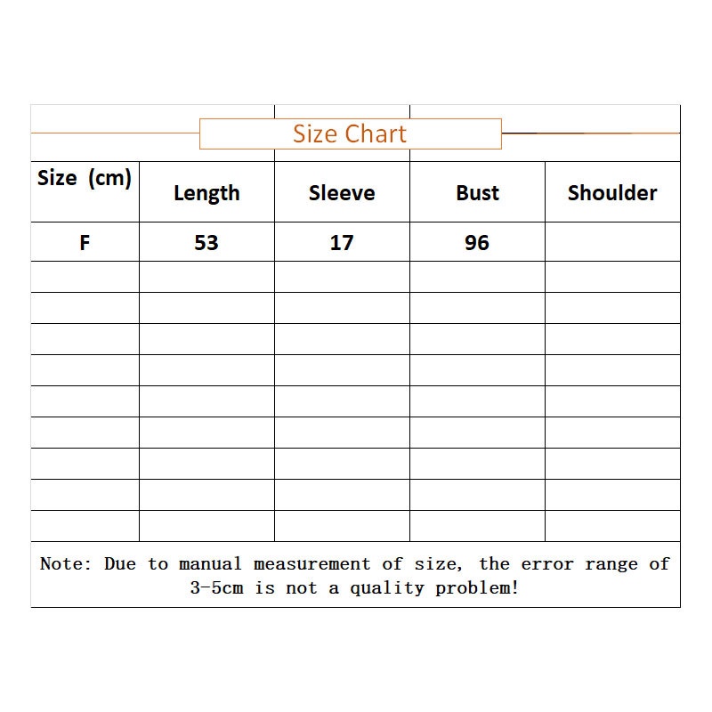 Một kích thước phù hợp với tất cả: Chiều dài: 53 Chiều dài tay áo: 17 Lật tẩy: 96