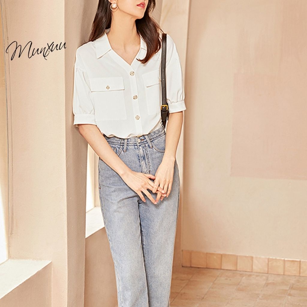 Giới thiệu Áo sơ mi nữ tay ngắn Munxuu thời trang công sở, thiết kế túi áo kiểu, cổ áo V thanh lịch - SP45
