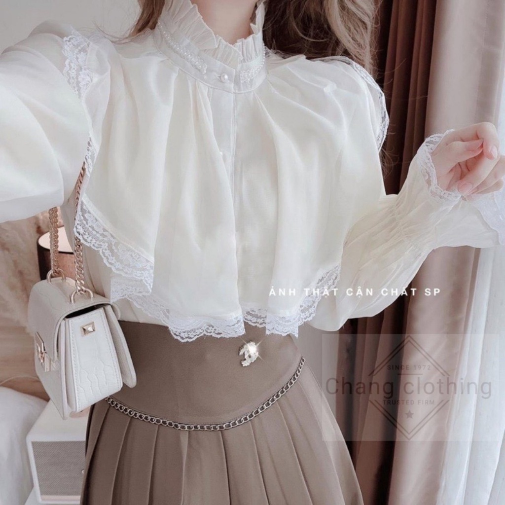 ÁO SƠ MI NỮ TAY PHỒNG TIỂU THƯ PHỐI REN HỌA TIẾT KIỂU DÁNG HÀN QUỐC MÀU TRẮNG KEM - ÁO SƠ MI TAY DÀI CÔNG SỞ NỮ MẶC ĐI LÀM ĐI HỌC