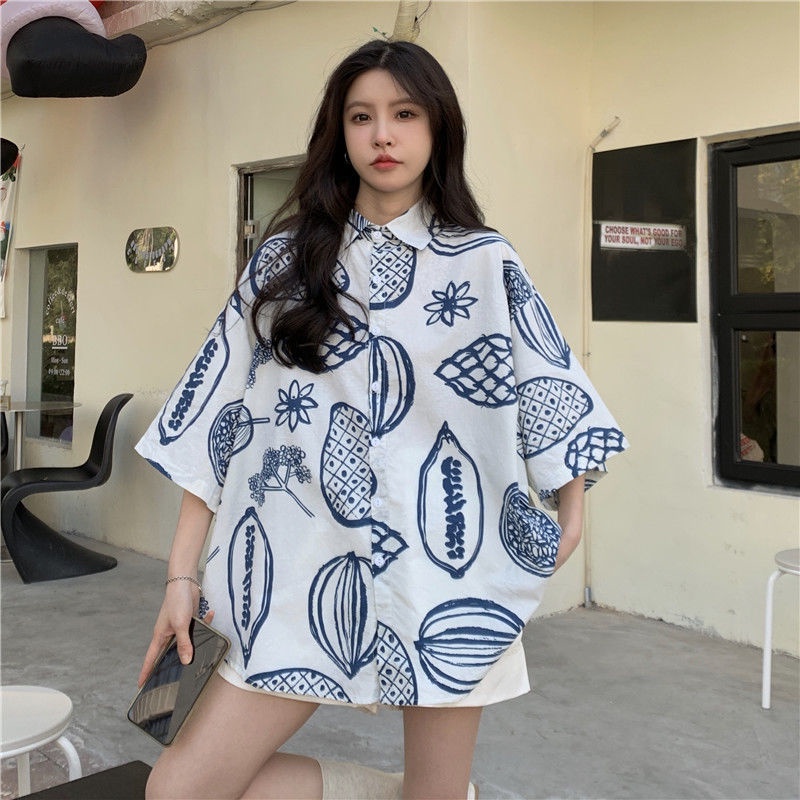 Giới thiệu Áo sơ mi RENJIANVSHENG 157456 ngắn tay họa tiết hoa trái cây phong cách retro Nhật Bản độc đáo
