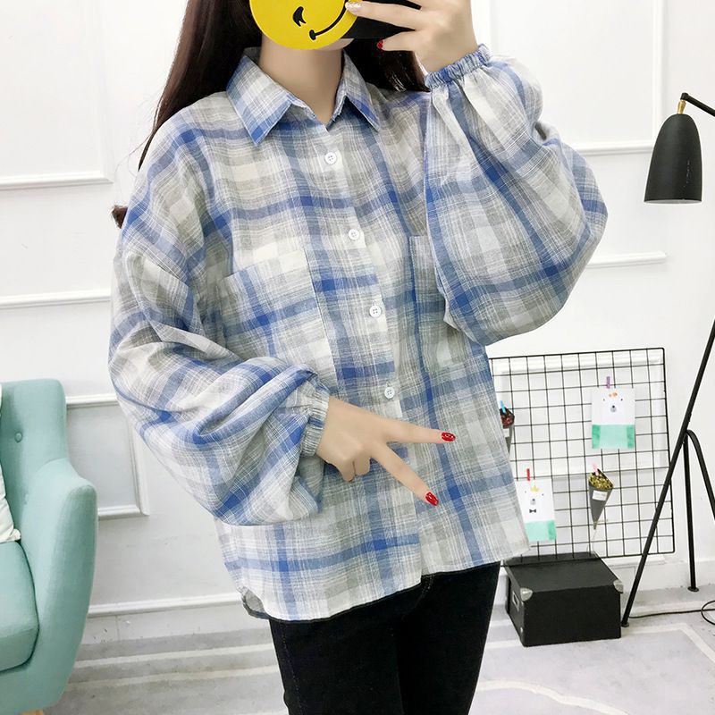 Áo sơ mi tay dài dáng rộng hoạ tiết sọc ca-rô phong cách retro