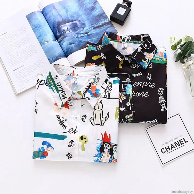 Áo sơ mi nữ in họa tiết hoạt hình dáng rộng tay dài kiểu vintgage thời trang cho nữ