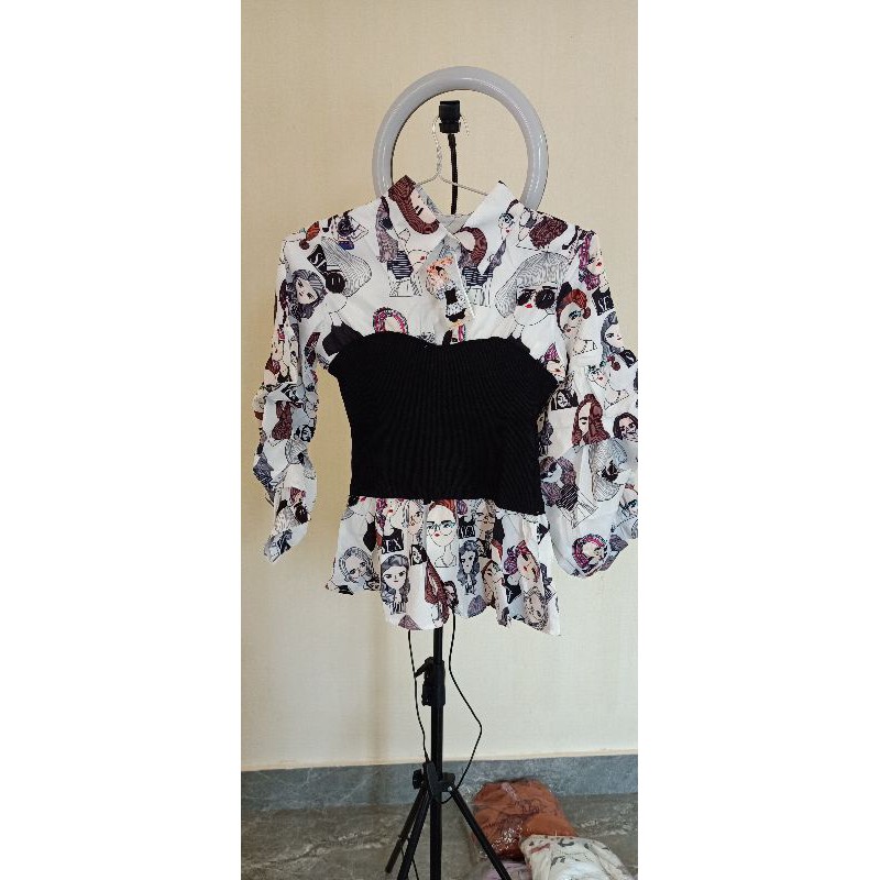 áo sơ mi kiểu in hình cô gái, tay phồng, eo chun có co dãn . Size cho người từ 43 đến 53kg mặc vừa.