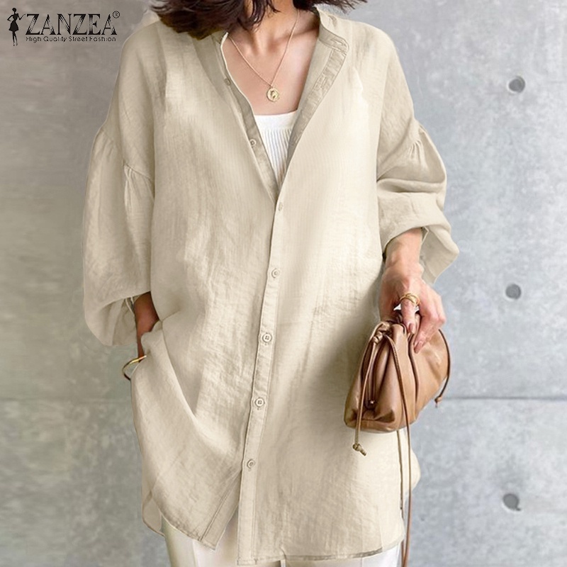 Giới thiệu Áo sơ mi ZANZEA dáng rộng cổ tròn tay dài màu trơn cài một hàng khuy phong cách retro thời trang thường ngày cho nữ