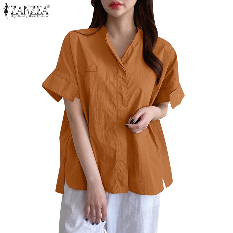Giới thiệu Áo sơ mi ZANZEA tay ngắn cổ đứng thiết kế xẻ tà phong cách thời trang dành cho nữ