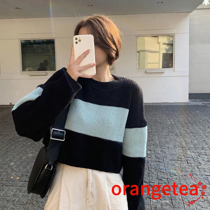 Giới thiệu Áo Sweater Dệt Kim Tay Dài Cổ Tròn Dáng Rộng Màu Tương Phản Thời Trang Mùa Thu Cho Nữ