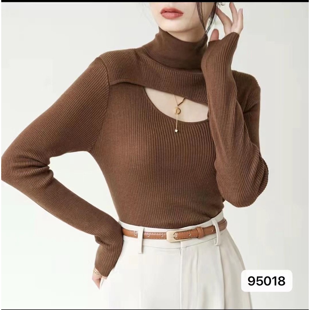 Giới thiệu Áo sweater tay dài cổ cao dáng ôm màu trơn khoét lỗ thời trang Hàn Quốc