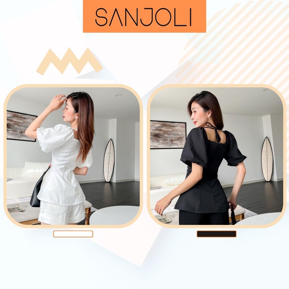Áo Tay Bồng SANJOLI Áo Công Sở Nữ Thiết Kế Cổ Vuông Dáng Xòe Đan Chéo Ngực Dây Buộc Phong Cách Công Sở AO018