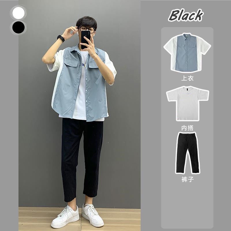 Giới thiệu Áo thun/ Áo sơ mi tay ngắn màu sắc tương phản/ Quần jean dài/ Vớ phong cách Nhật Bản thời trang cho nam
