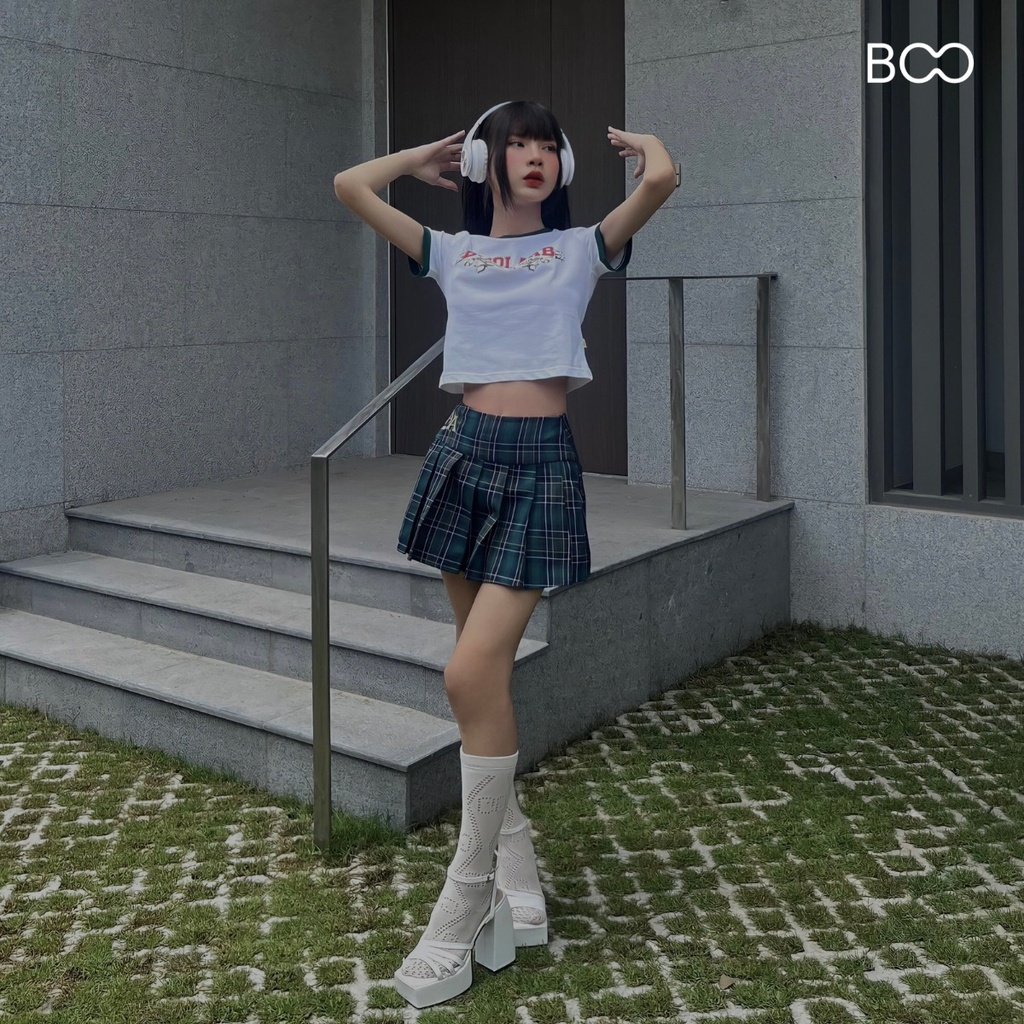 - Áo crop dáng ôm sát cơ thể, với thiết kế hiện đại, viền cổ màu xanh lá đậm, trước ngực được in chữ Boolaab làm nổi bật nhận diện thương hiệu cùng hình in quả bông