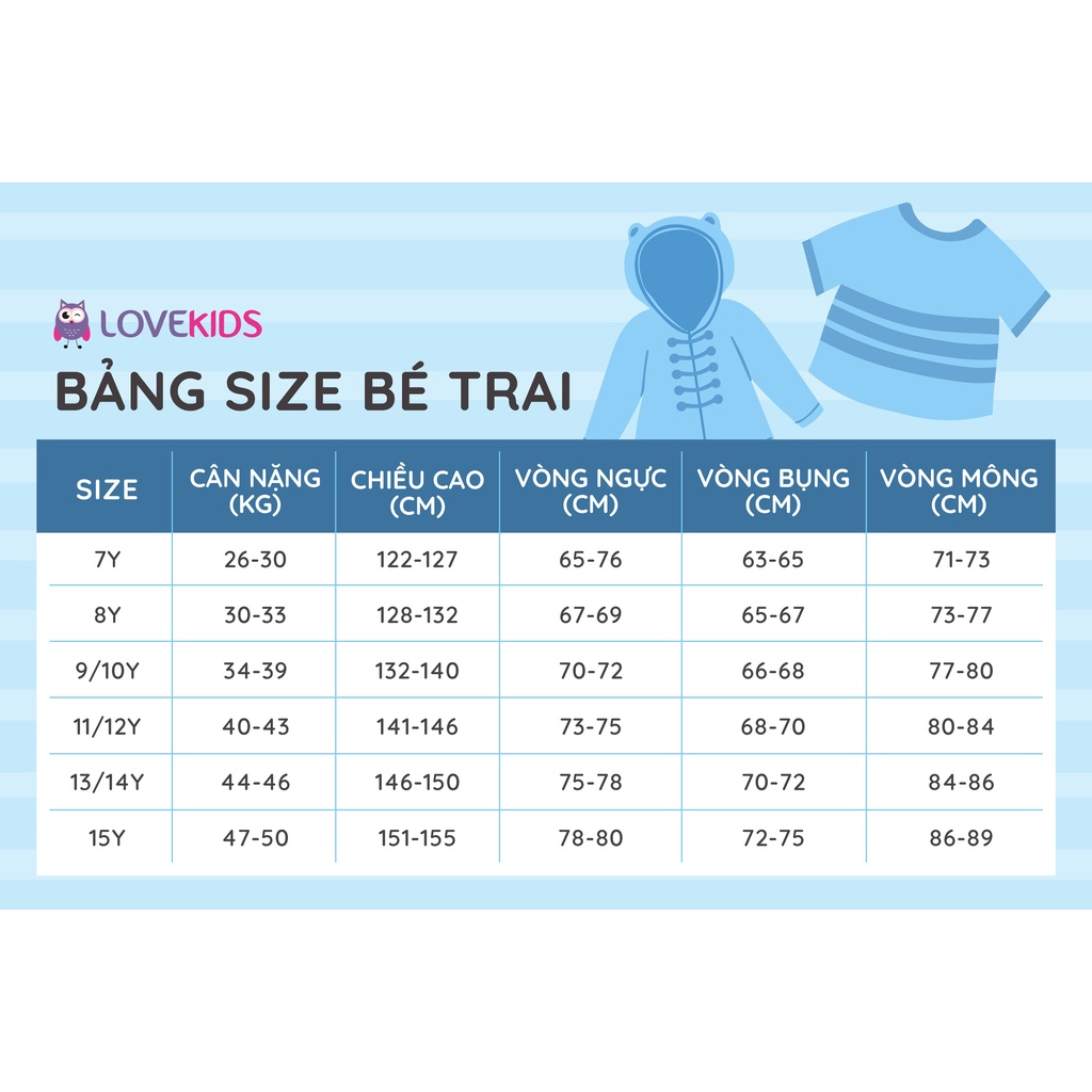 * CHÍNH SÁCH ĐỔI SẢN PHẨM Thời gian đổi sản phẩm: Theo qui định đổi trả của ShopeeMall. Để lựa chọn sản phẩm vừa vặn với bé, các mẹ có thể tham khảo bảng size hoặc gửi tin nhắn ngay cho Lovekids để nhận được hỗ trợ nhé. ---------------------------------------------------------- Công ty Cổ phần LoveKids được thành lập vào năm 2015, hoạt động trong lĩnh vực sản xuất và phân phối sản phẩm thời trang trẻ em xuất khẩu. Chúng tôi mong muốn mang đến một sản phẩm của người Việt nhưng chất lượng có thể đáp ứng được nhu cầu của khách hàng trên toàn thế giới. Hiện nay, các sản phẩm của chúng tôi đã có mặt tại nhiều cửa hàng và trung tâm thương mại lớn ở Việt Nam cùng hơn 100,000 khách hàng tin tưởng và ủng hộ. Lovekids đang không ngừng nỗ lực để khẳng định tên tuổi của mình trong làng thời trang trẻ em.