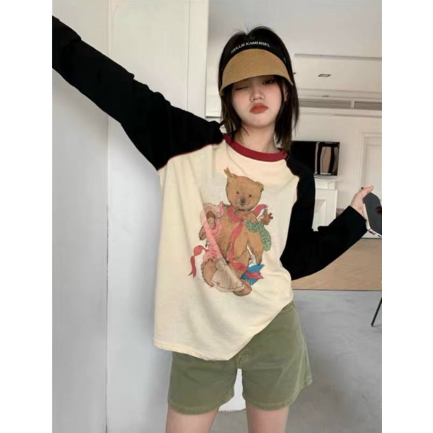 Giới thiệu Áo Thun Cotton Giấy Họa Tiết in hình GẤU TAY DÀI PHỐI MÀU, Dáng Áo Rộng Dấu Quần Thương Thương Shop