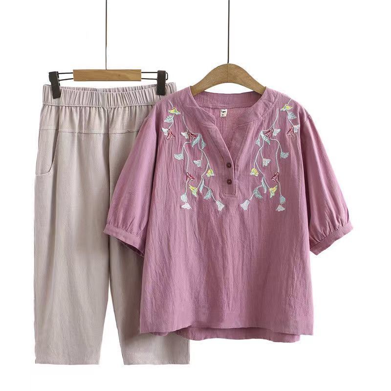 Phong cách: Đi lại đơn giản / Đơn giản Các yếu tố phổ biến: Màu đồng nhất, Thêu Phong cách: Bộ quần áo Chiều dài tay áo: Tay áo ngắn Vải / chất liệu: Bông / Bông Nội dung thành phần: 31% (Bao gồm) -50% (Bao gồm) Độ tuổi áp dụng: Trung niên (41-60 tuổi)
