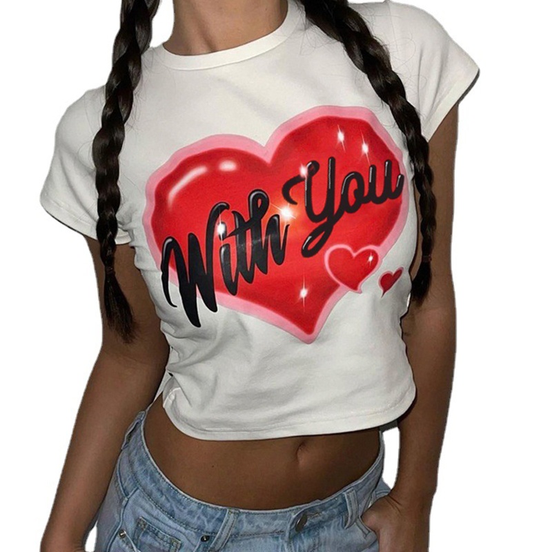 Phụ nữ tay ngắn cổ chữ O Cổ Crop Top Harajuku Valentines Love Heart Letter Graphic Print T-Shirt 90s thẩm mỹ Slim Blouse Thương hiệu mới và chất lượng cao