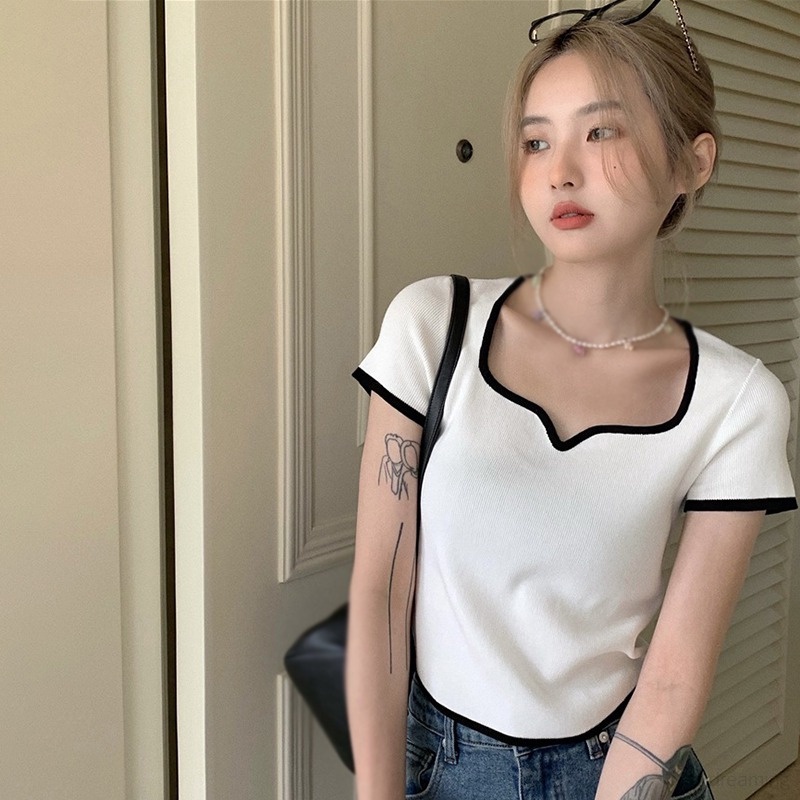 1. Phiên bản Hàn Quốc, dây chuyền cổ vuông đồng màu khâu không đều, áo thun ngắn tay đa năng thời trang.