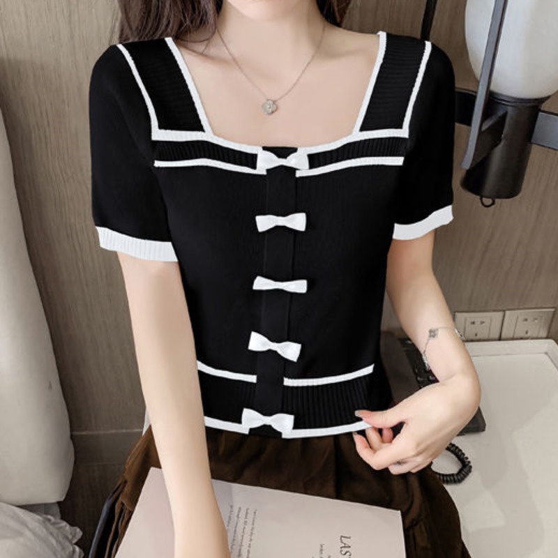Giới thiệu Áo Thun Dệt Kim Cổ Vuông Thắt Nơ Phong Cách Hàn Quốc 185275 Áo Thun Ngắn Dáng Ôm Thời Trang Mùa Hè Dành Cho Nữ